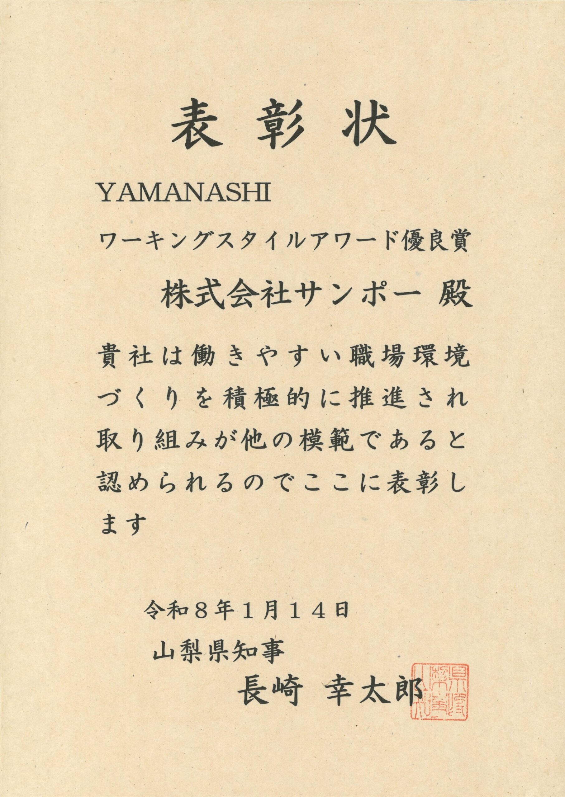 YAMANASHIワーキングスタイルアワード優良賞を受賞しました。